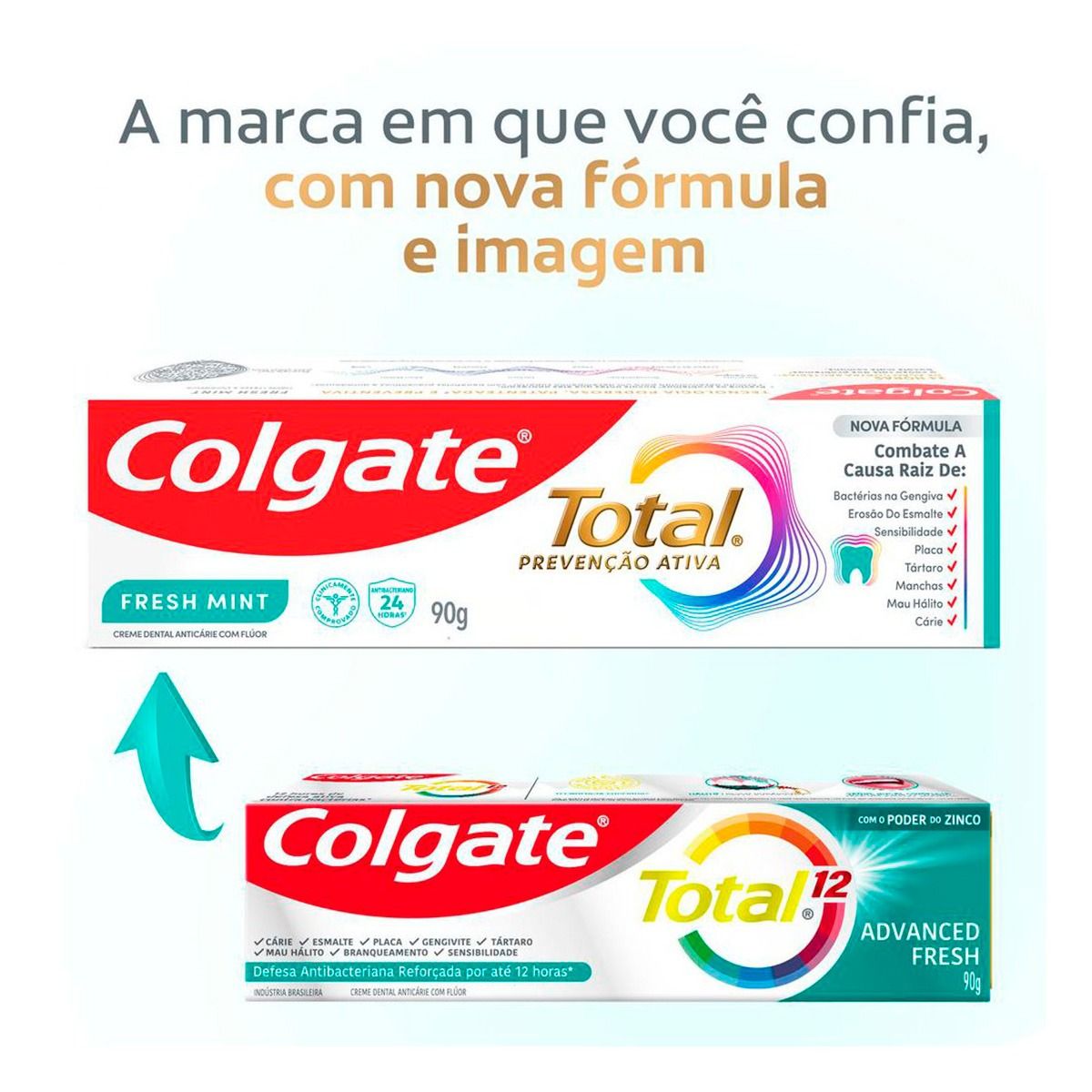 Colgate Total Fresh Mint é ideal para uso diário, é clinicamente comprovado, oferece 24 horas de ação contra bactérias* e ajuda a prevenir problemas bucais antes que apareçam: bactérias nas gengivas, erosão do esmalte, sensibilidade nos dentes, placa bacteriana, tártaro dental, manchas nos dentes, mau hálito e cárie dental.