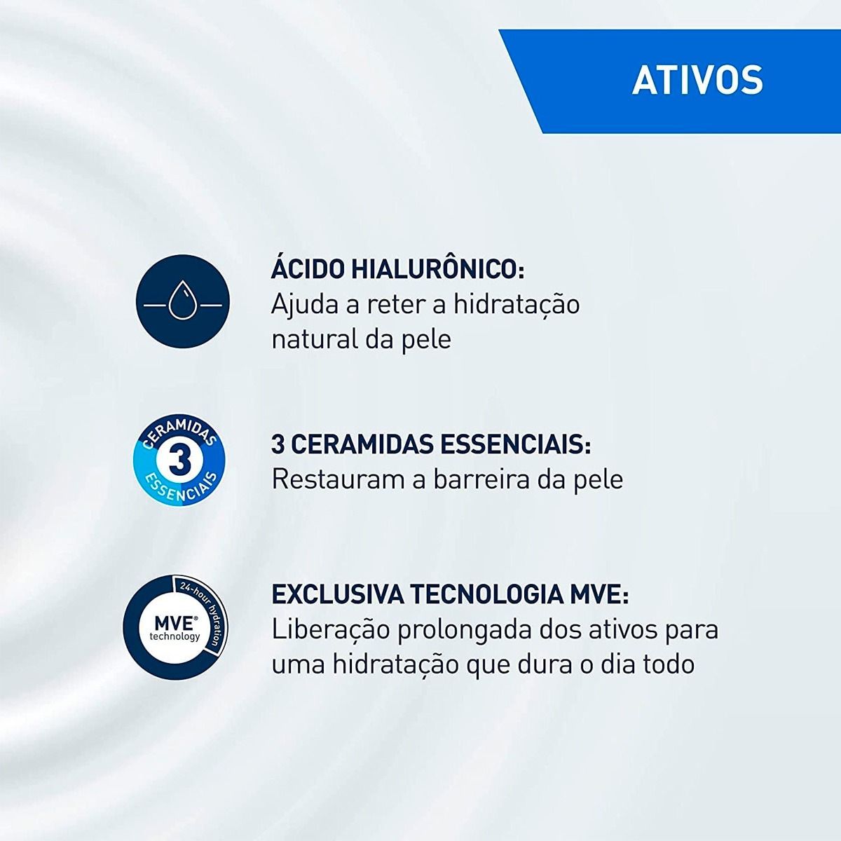 Quando a barreira da pele está comprometida, pode ocorrer ressecamento e coceira. No entanto, um creme hidratante com ácido hialurônico e 3 ceramidas essenciais pode ajudar. Ao hidratar a pele e restaurar sua barreira natural, um creme com esses ingredientes pode ajudar aqueles com pele seca a muito seca a melhorar a aparência e a sensação da pele. O CeraVe Creme Hidratante inclui três ceramidas essenciais e ácido hialurônico para hidratar profundamente e restaurar a barreira protetora da pele. Desenvolvido com dermatologistas e adequado para pele seca e muito seca no rosto e corpo, este creme hidratante rico, não oleoso e de rápida absorção apresenta nossa tecnologia patenteada MVE para liberar uma corrente constante de ingredientes hidratantes ao longo do dia e da noite. O CeraVe Creme Hidratante é livre de fragrâncias.