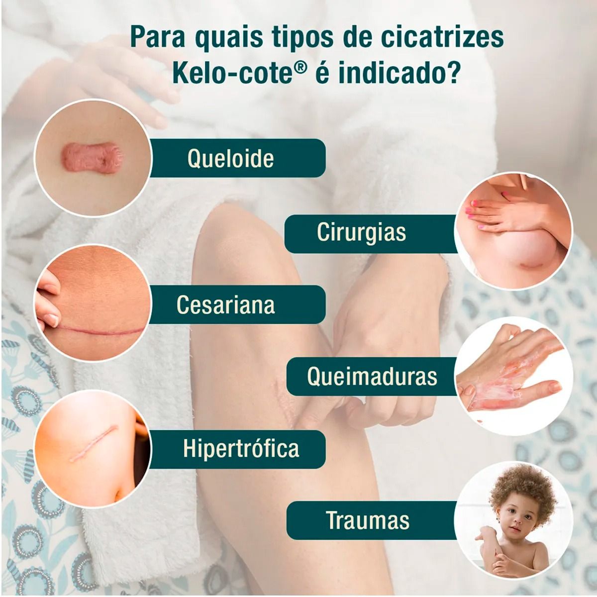 Kelo-Cote® Gel é indicado para prevenção e tratamento de cicatrizes hipertróficas e queloides causadas por cirurgias, traumas, feridas ou queimaduras. Com sua fórmula avançada, forma uma camada protetora invisível e autossecante, que hidrata, reduz a vermelhidão, a espessura e a rigidez das cicatrizes, tornando-as mais suaves e menos visíveis.