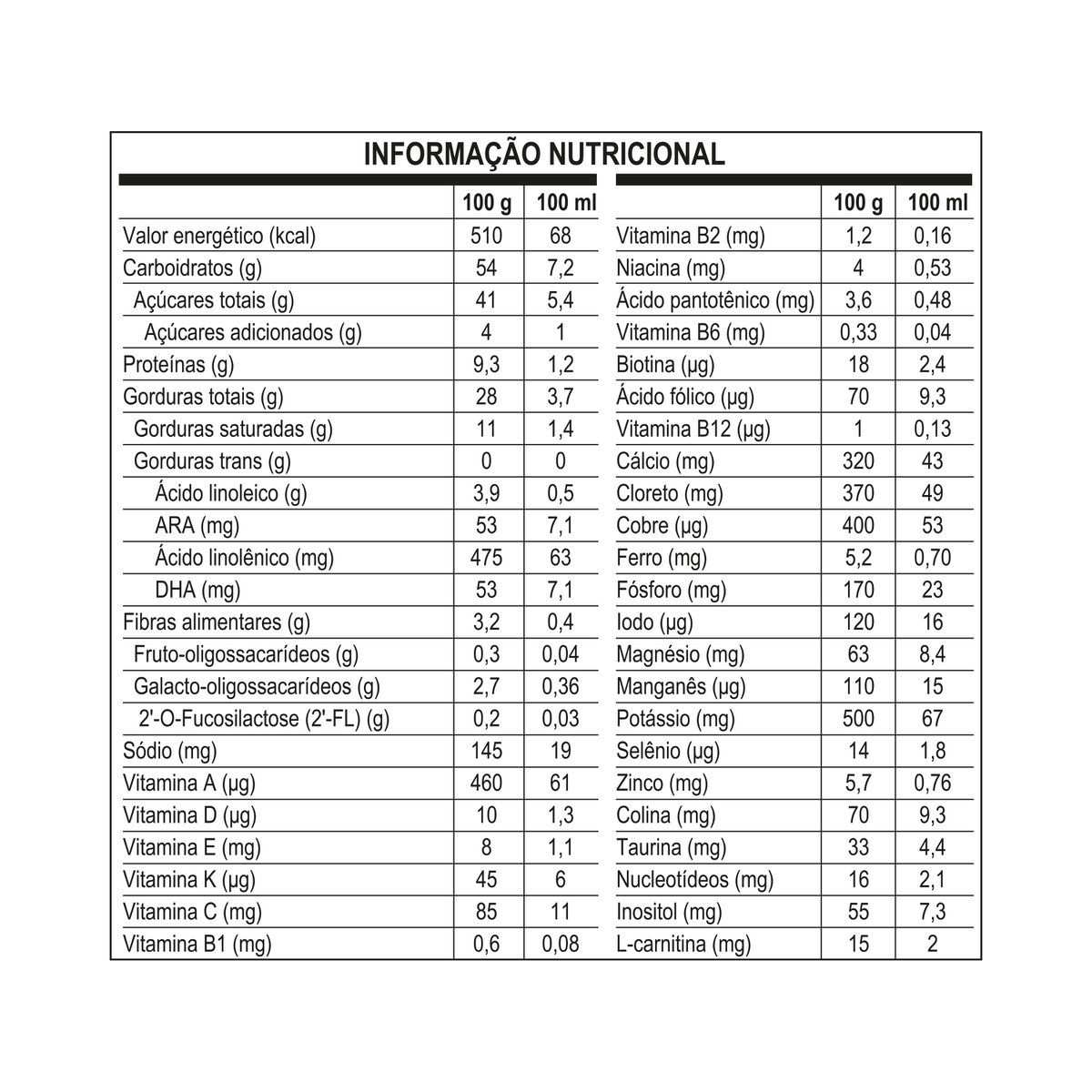 | Composição | Com ARA, Com Biotina, Com Cálcio, Com Cobre, Com DHA, Com EPA, Com Ferro, Com Fibra Prebiótica, Com Fósforo, Com Iodo, Com Magnésio, Com Maltodextrina, Com Nucleotídeos, Com Óleo de Girassol, Com Óleo de Palma, Com Potássio, Com Prebióticos, Com Selênio, Com Sódio, Com Vitamina A, Com Vitamina B1, Com Vitamina B12, Com Vitamina B2, Com Vitamina B3, Com Vitamina B5, Com Vitamina B6, Com Vitamina B9, Com Vitamina C, Com Vitamina D, Com Vitamina E, Com Vitamina K, Com Zinco |