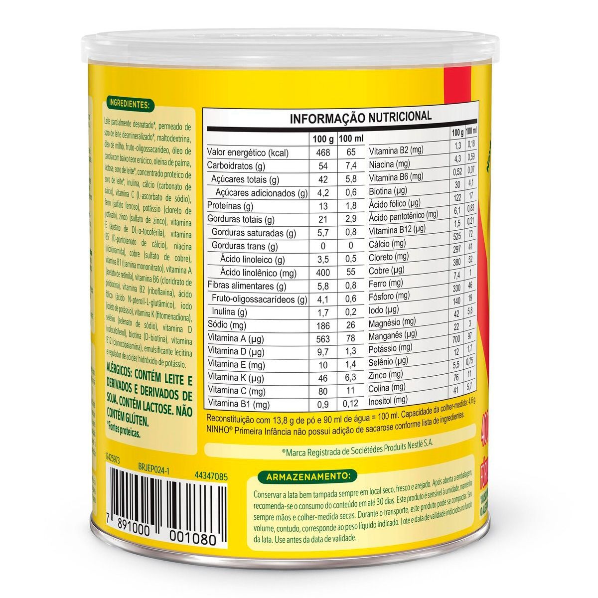 Ingredientes: Leite parcialmente desnatado*, permeado de soro de leite desmineralizado*, maltodextrina, óleo de milho, fruto-oligossacarídeo, óleo de canola com baixo teor erúcico, oleína de palma, lactose, soro de leite*, concentrado proteico de soro de leite*, inulina, cálcio (carbonato de cálcio), vitamina C (L-ascorbato de sódio), ferro (sulfato ferroso) potássio (cloreto de potássio), zinco (sulfato de zinco), vitamina E (acetato de DL-a-tocoferila), vitamina B5 (D-pantotenato de cálcio), niacina (nicotinamida), cobre (sulfato de cobre), vitamina B1 (tiamina mononitrato), vitamina A (acetato de retinila), vitamina B6 (cloridrato de piridoxina), vitamina B2 (riboflavina), ácido fólico (ácido N-pteroil-L-glutâmico), iodo (iodeto de potássio), vitamina K (fitomenadiona), selênio (selenato de sódio), vitamina D (colecalciferol), biotina (D-biotina), vitamina B12 (cianocobalamina), emulsificante lecitina de soja e regulador de acidez hidróxido de potássio. * fonte de proteínas.
