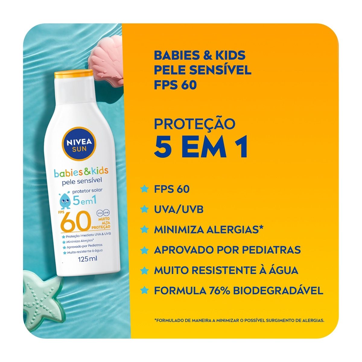 O Protetor Solar Nivea Sun Kids Sensitive FPS 60 é ideal para crianças com pele sensível. Oferece alta proteção UVA/UVB, é resistente à água e minimiza alergias por não ter perfumes ou corantes. Escolha considerando a sensibilidade da pele do seu filho.